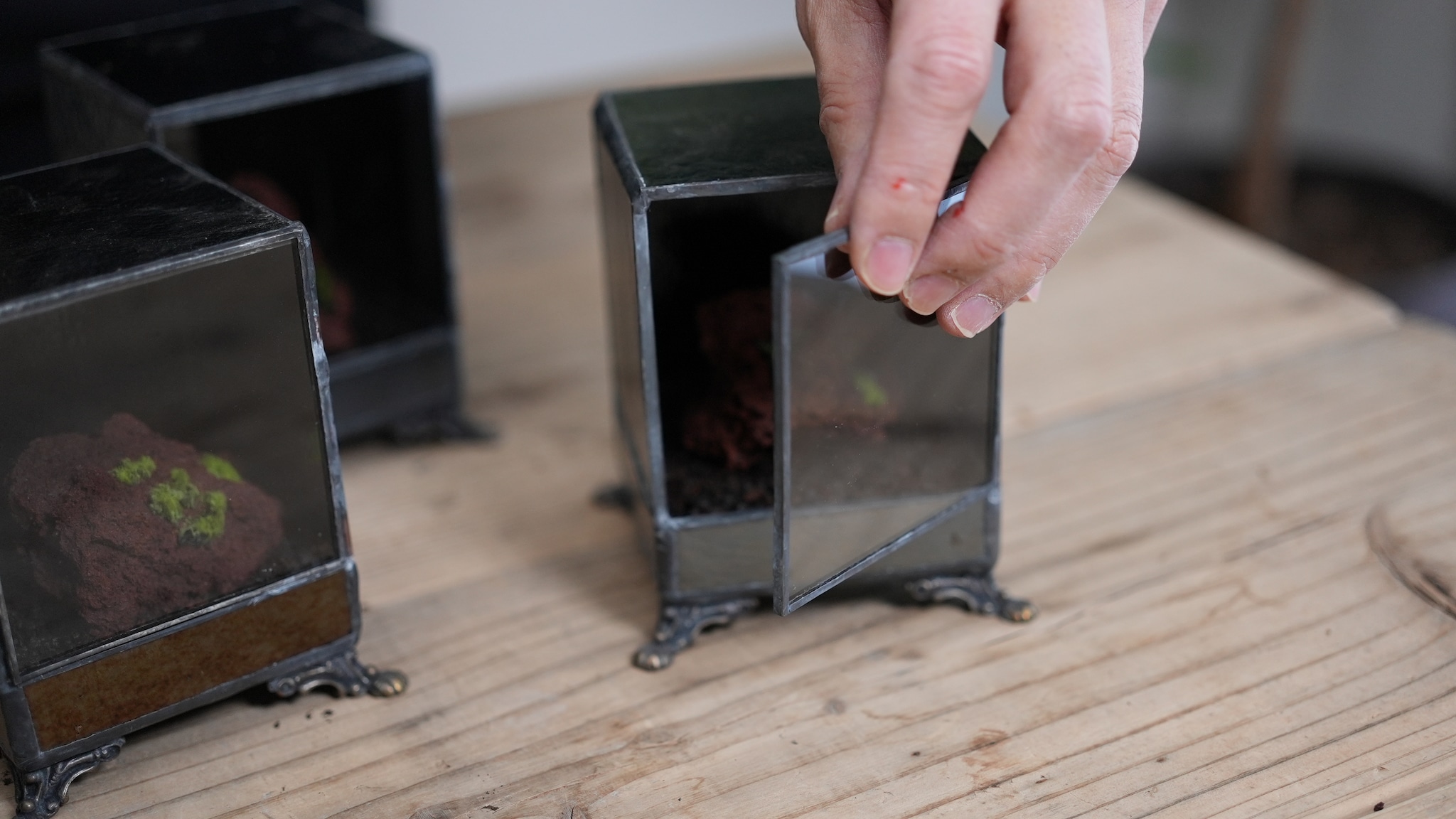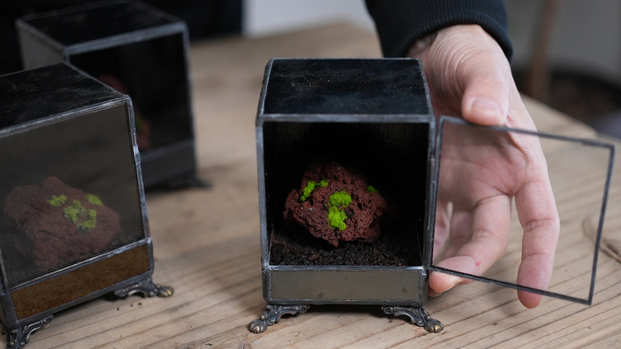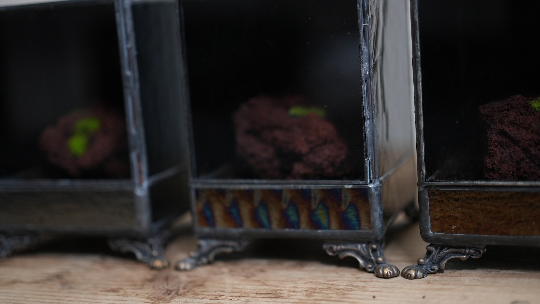 色々なガラスを組み合わせるステンドグラスだからこそ作れる、ヒカリゴケのためだけの容器ができました。