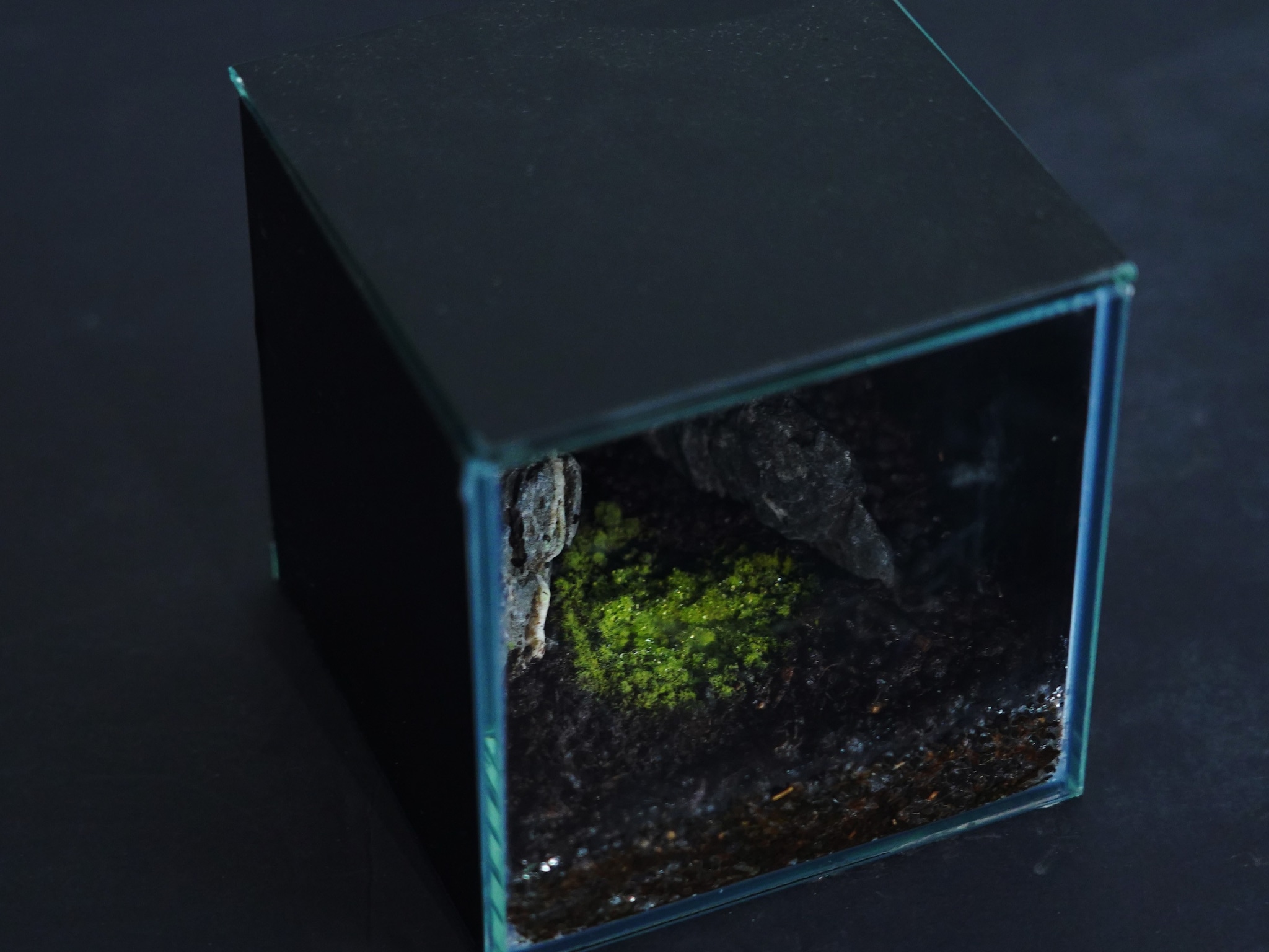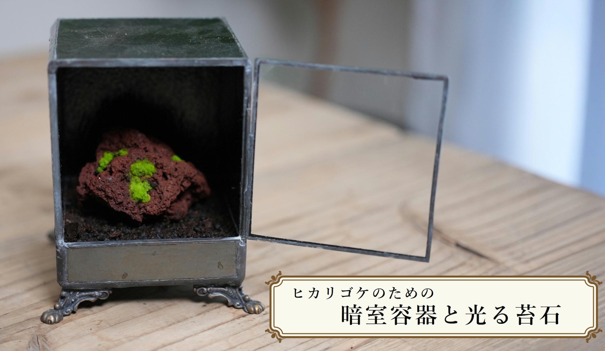 『ヒカリゴケのための暗室容器と光る苔石』