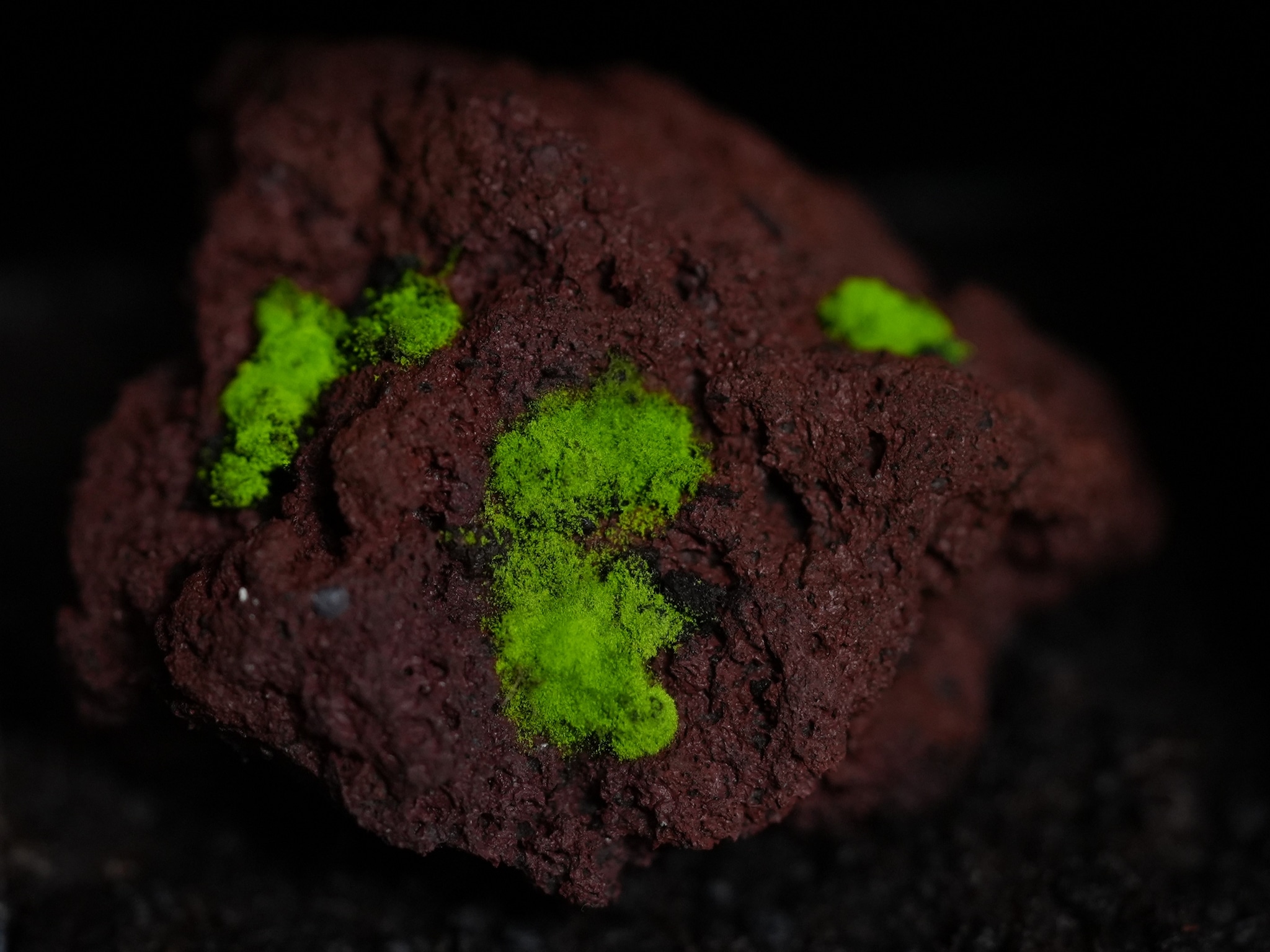 赤色溶岩石に着生させたヒカリゴケ