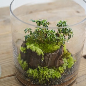 苔むした大きな切り株から若木が芽生える風景盆栽タイプのテラリウムです。