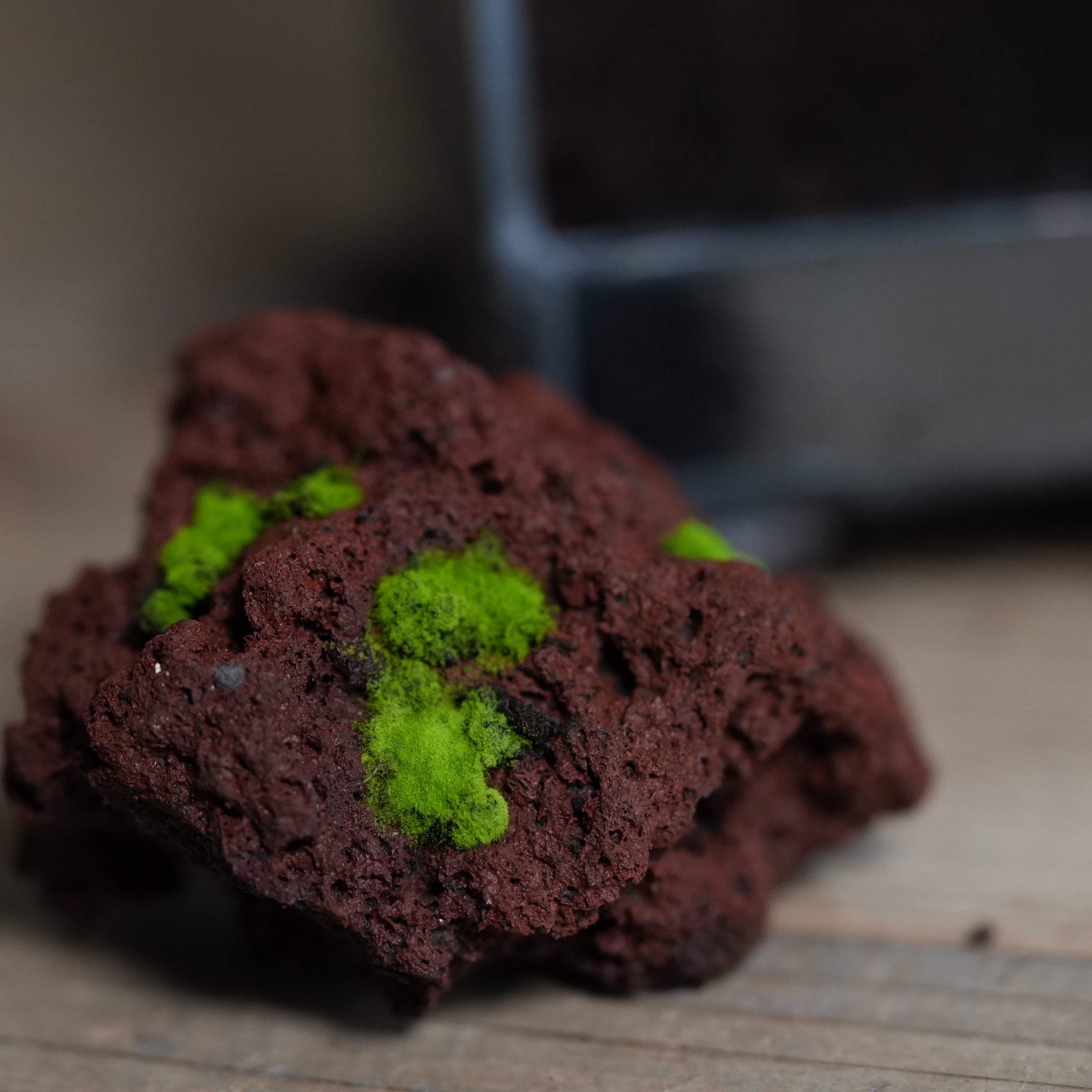 着生の基盤に使ったのは、緑色に光るヒカリゴケが映える赤色溶岩石。