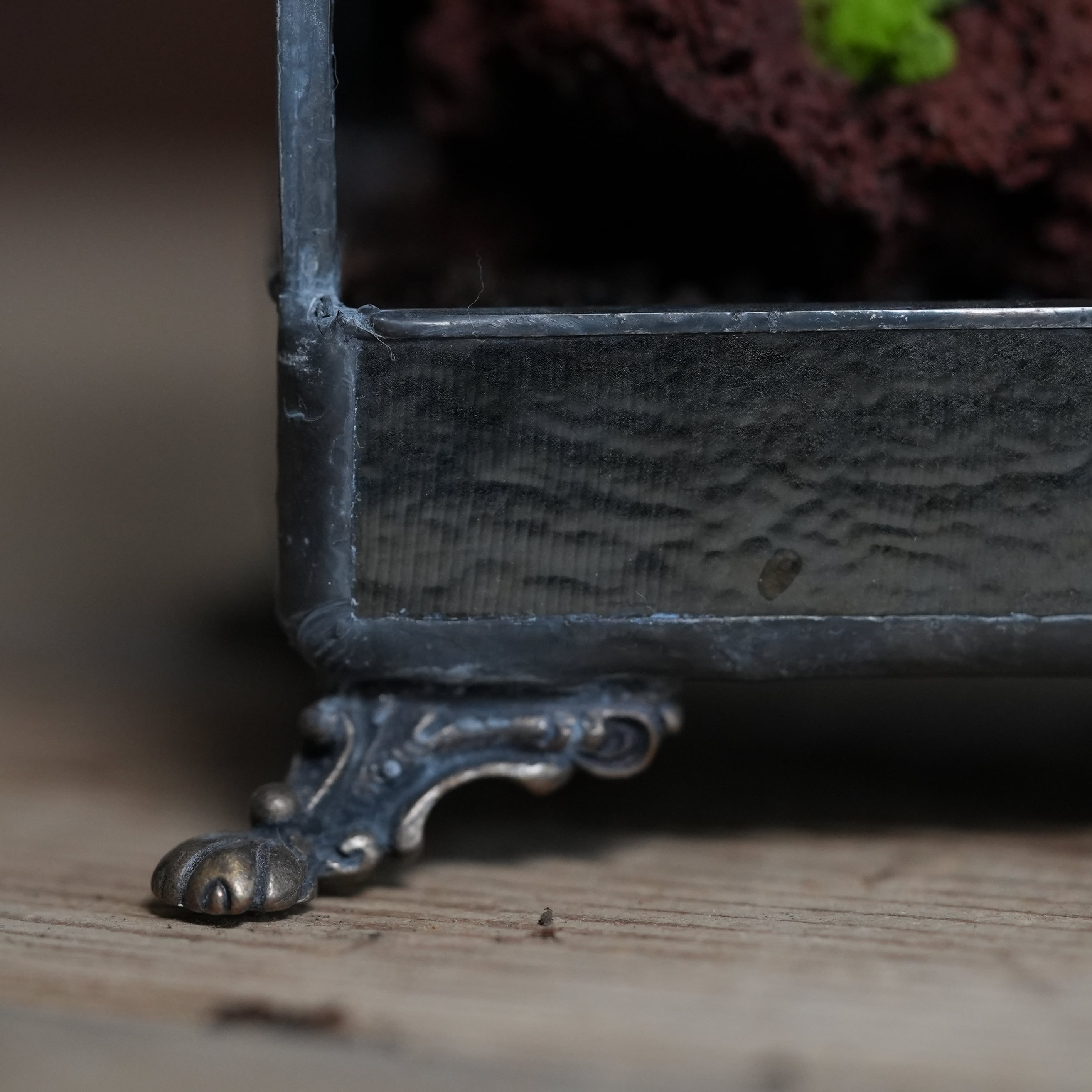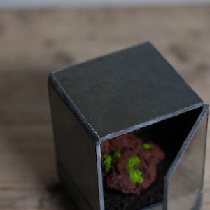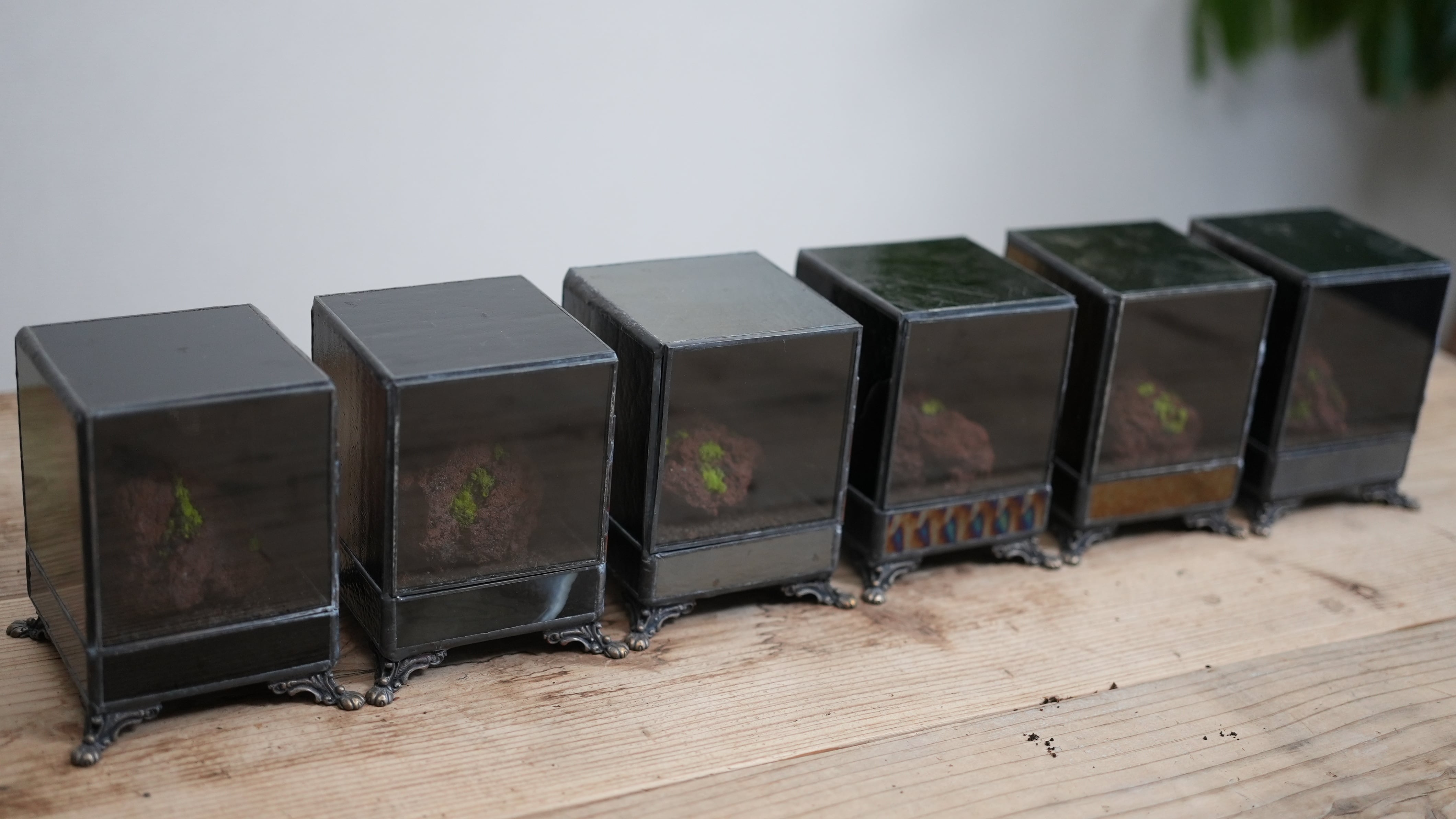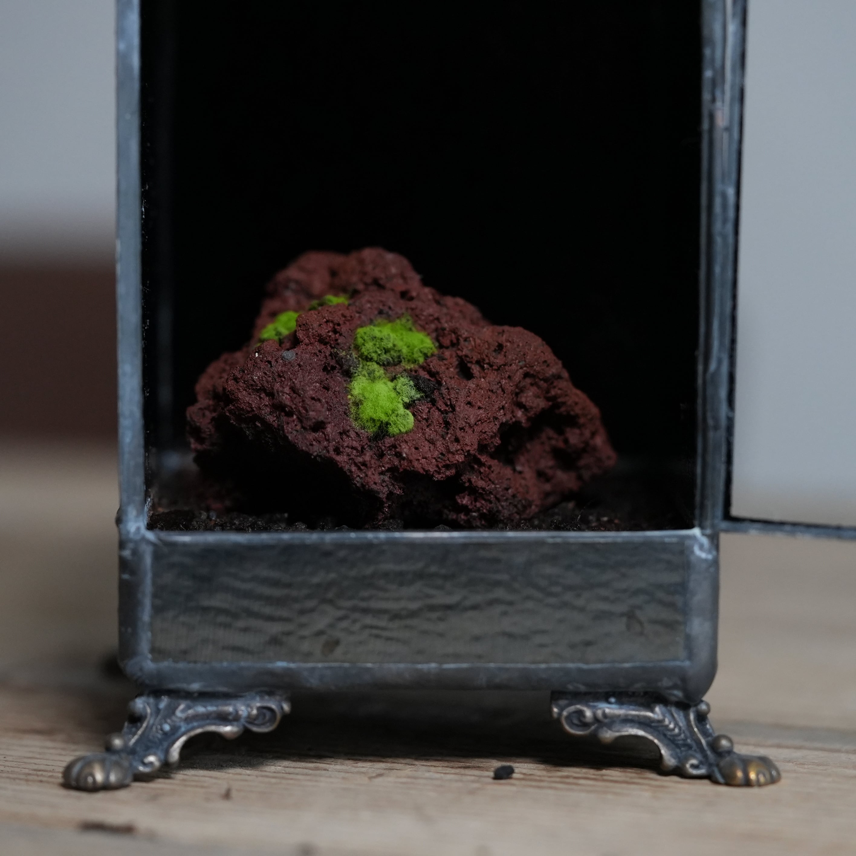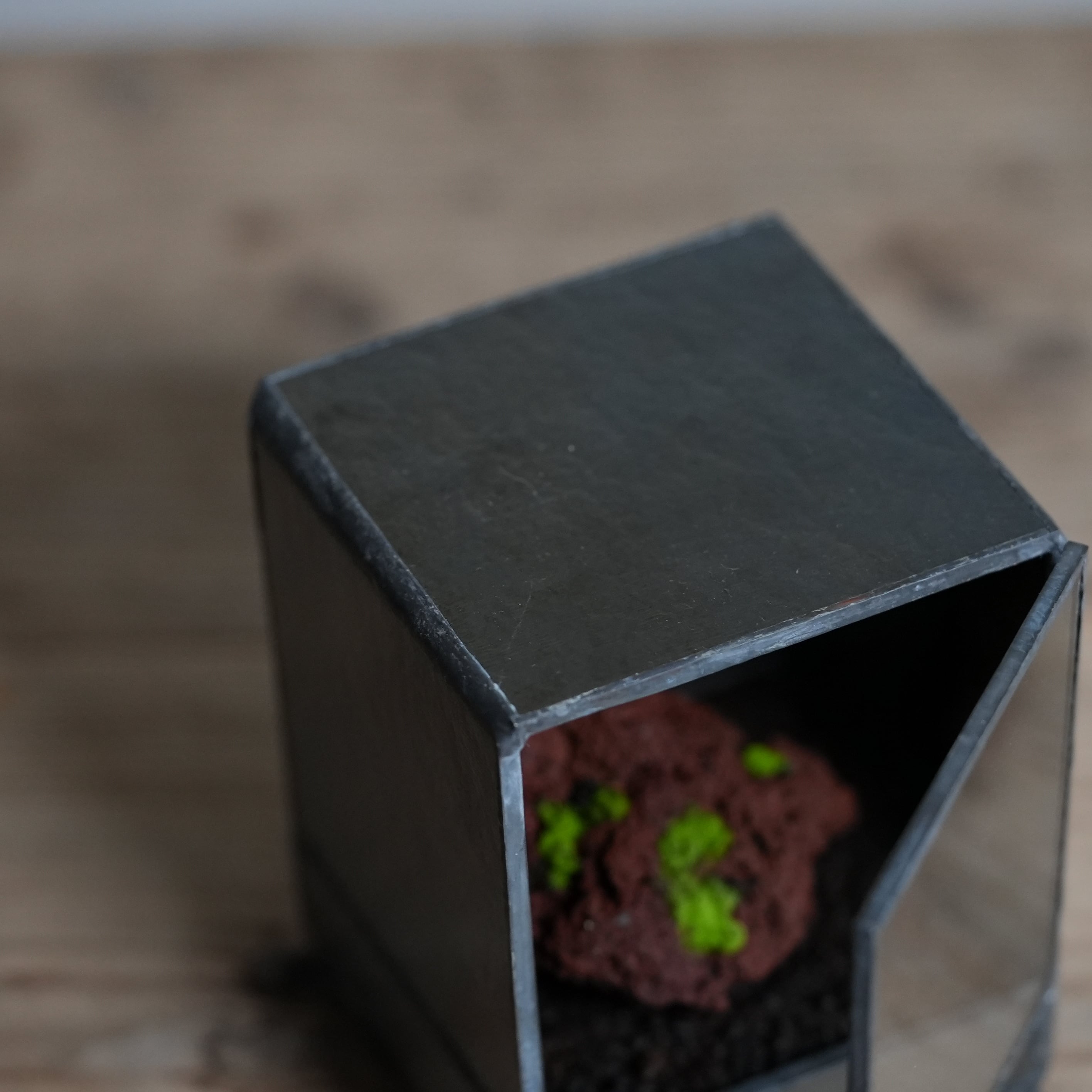 正面以外のガラスに黒ガラスを使い、ヒカリゴケのための暗室のような容器ができあがりました。
