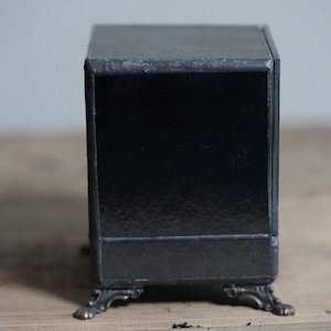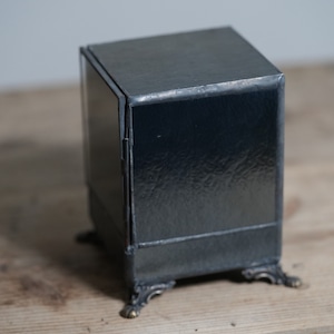 足つきのアンティーク風デザインと前に開く扉はまるで宝箱のよう。