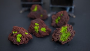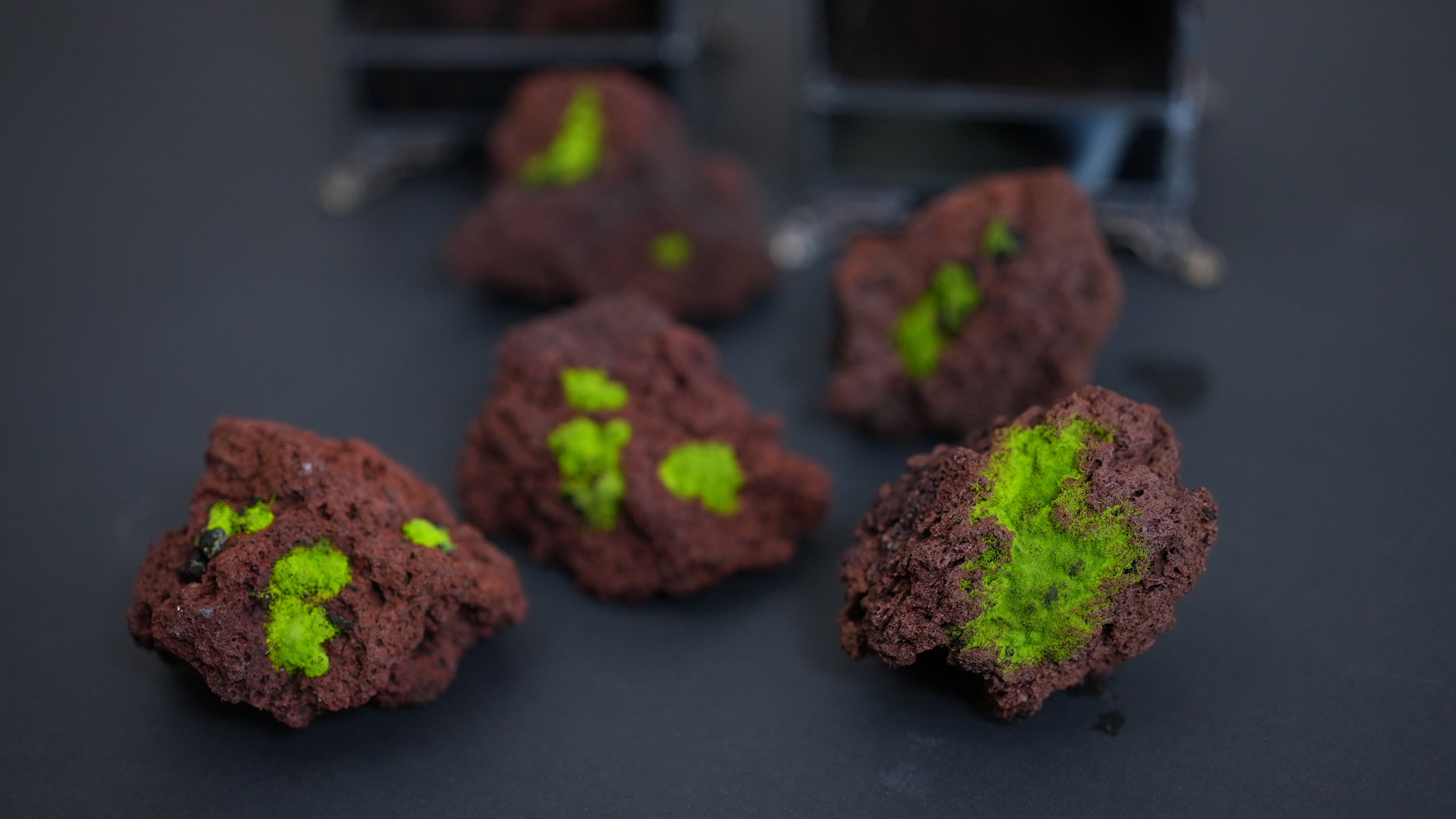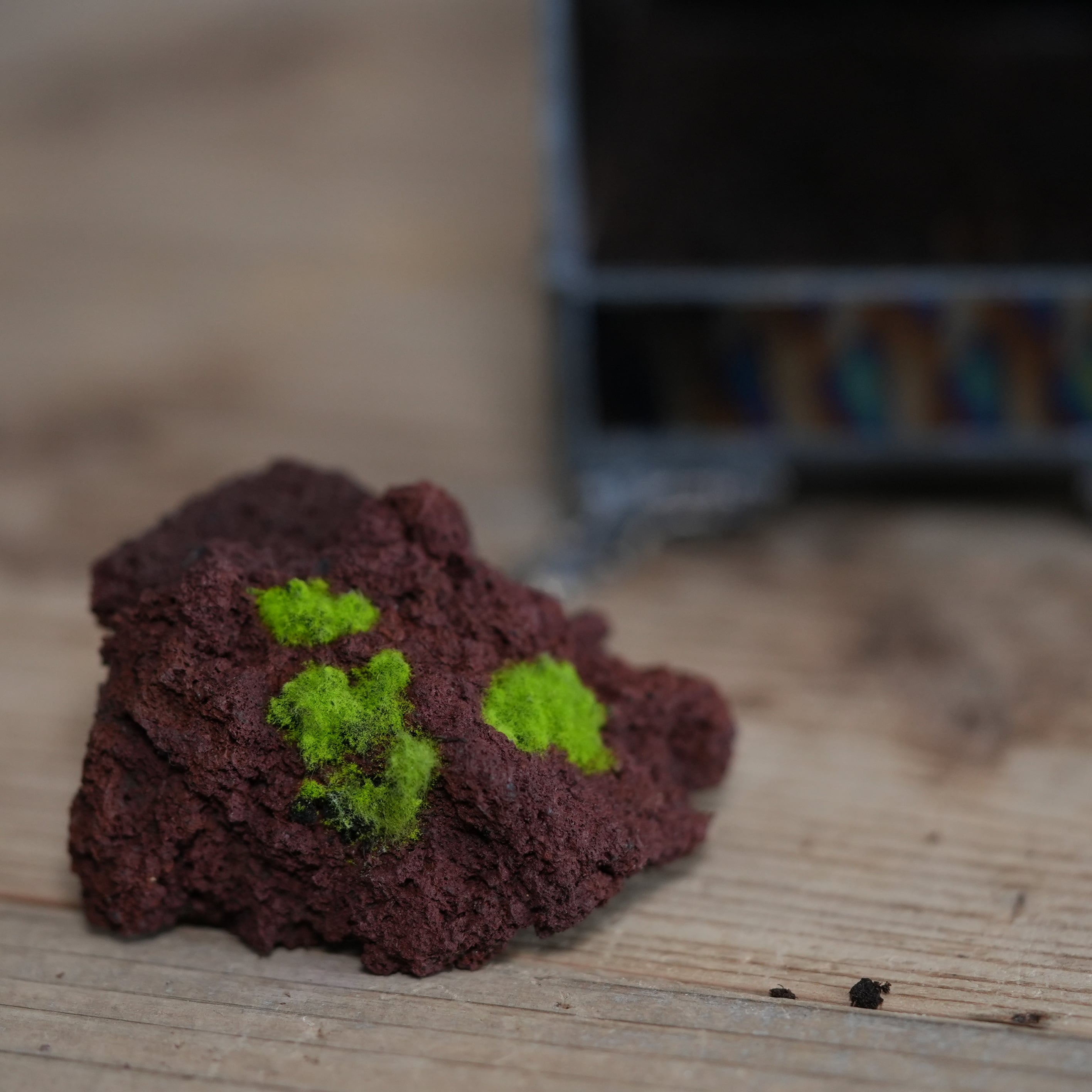 着生の基盤に使ったのは、緑色に光るヒカリゴケが映える赤色溶岩石。