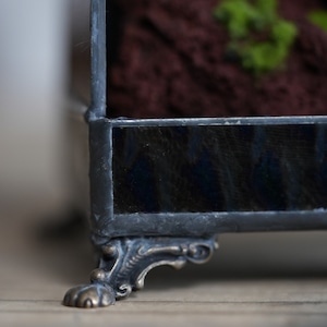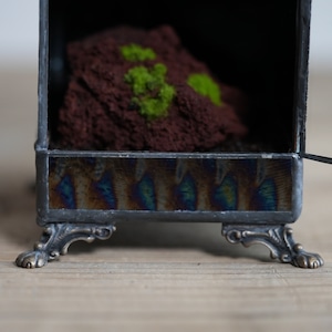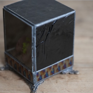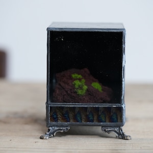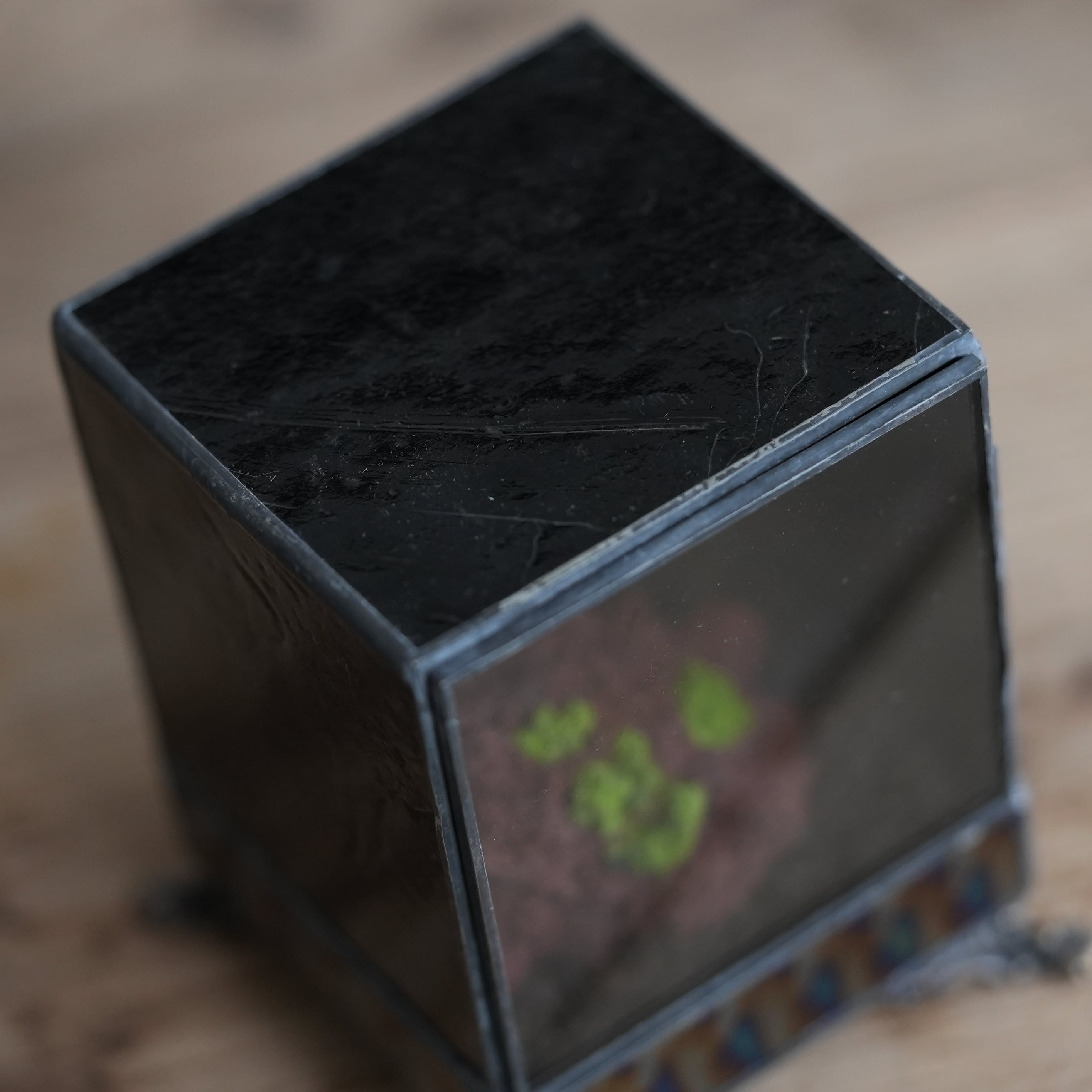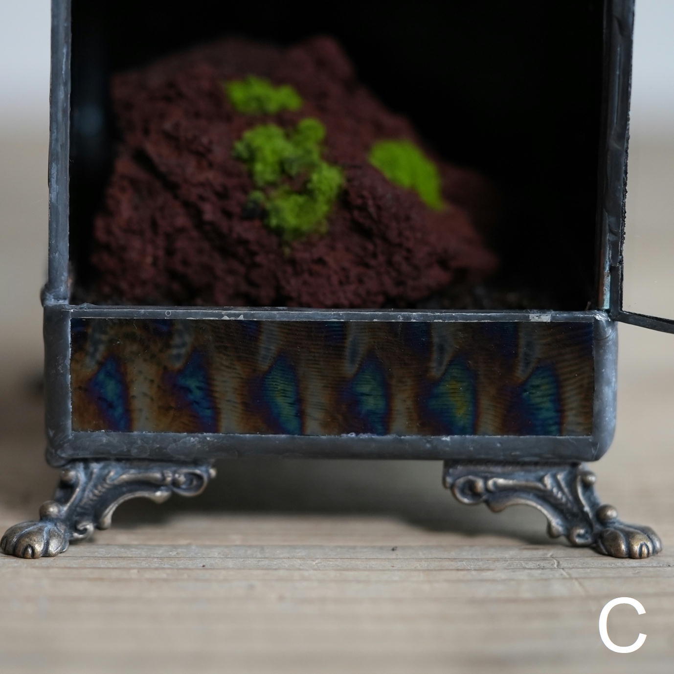 正面以外のガラスに黒ガラスを使い、ヒカリゴケのための暗室のような容器ができあがりました。