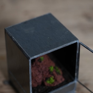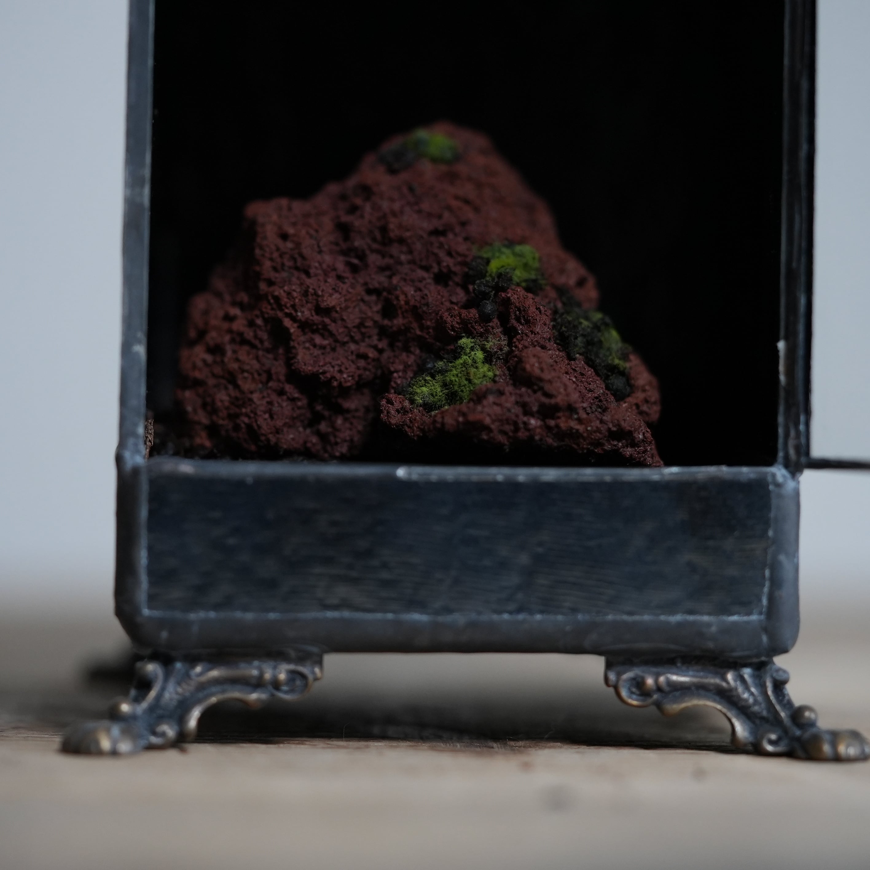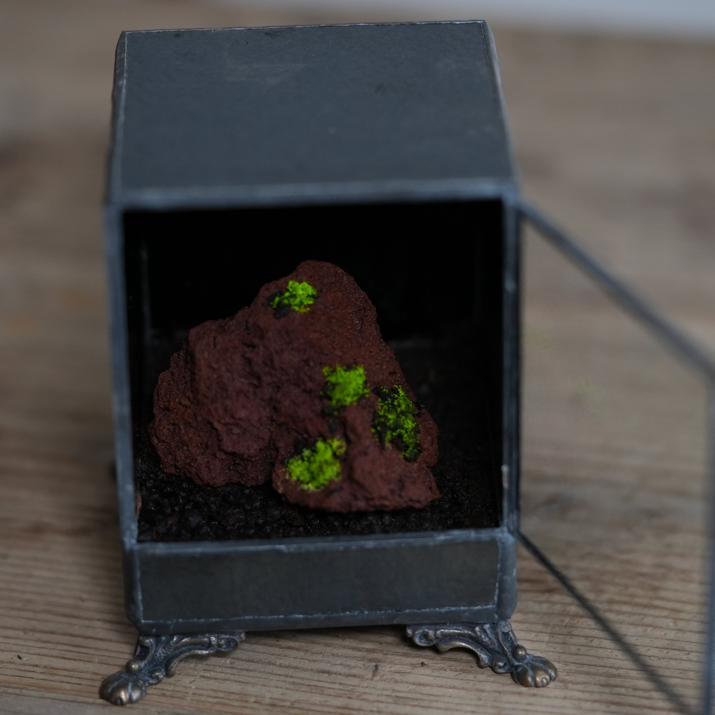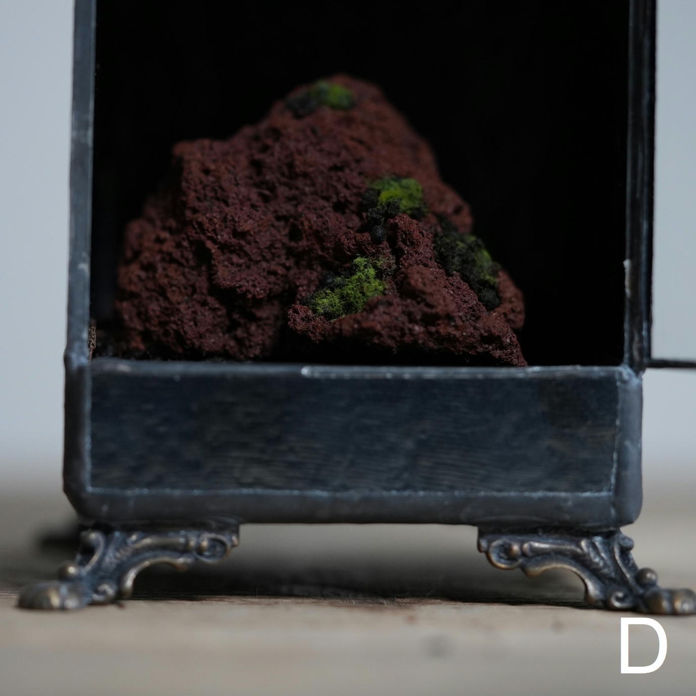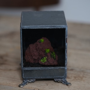 正面以外のガラスに黒ガラスを使い、ヒカリゴケのための暗室のような容器ができあがりました。