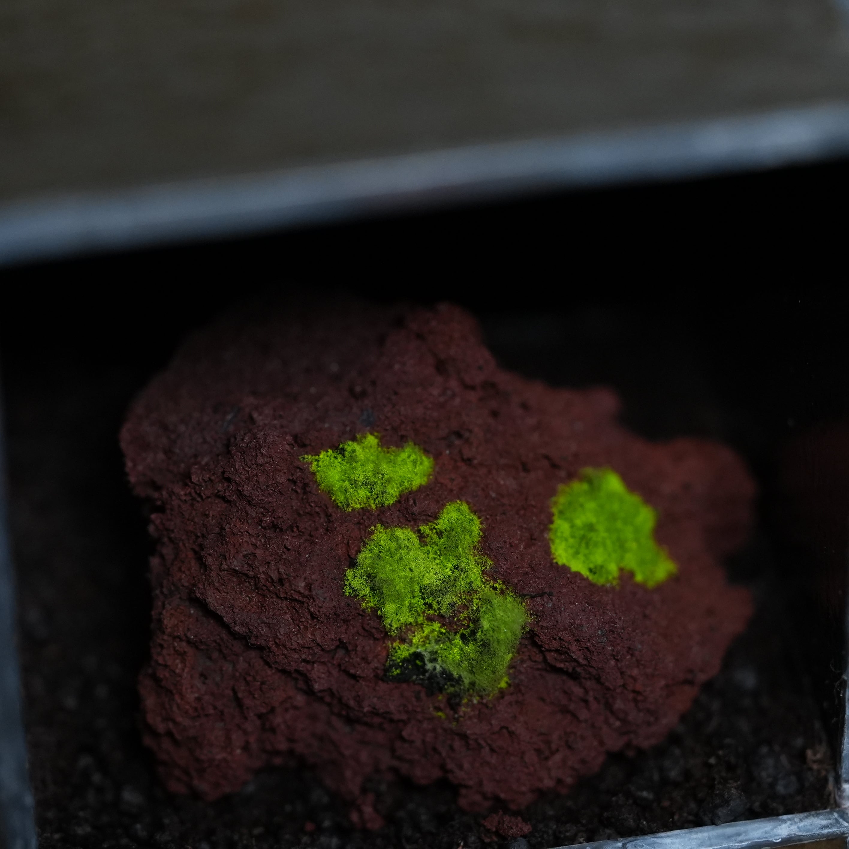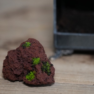 着生の基盤に使ったのは、緑色に光るヒカリゴケが映える赤色溶岩石。