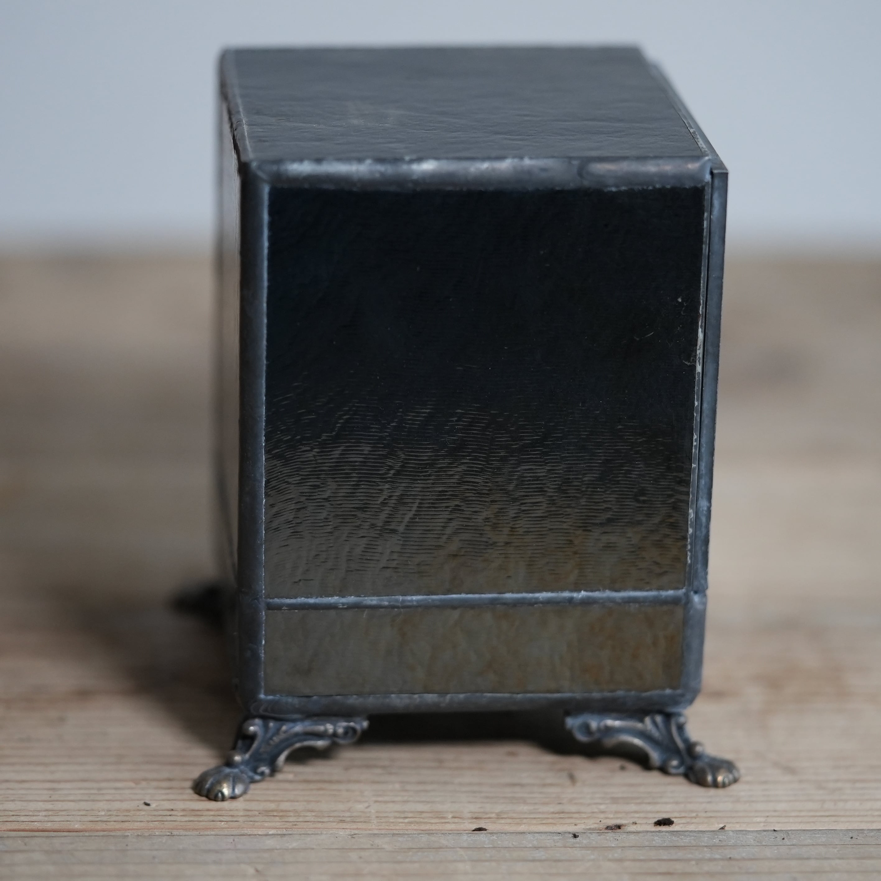 足つきのアンティーク風デザインと前に開く扉はまるで宝箱のよう。