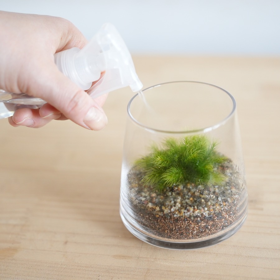 ・水 1週間に一度、霧吹きで与えます。コケの表面を湿らせる程度に与えて下さい。