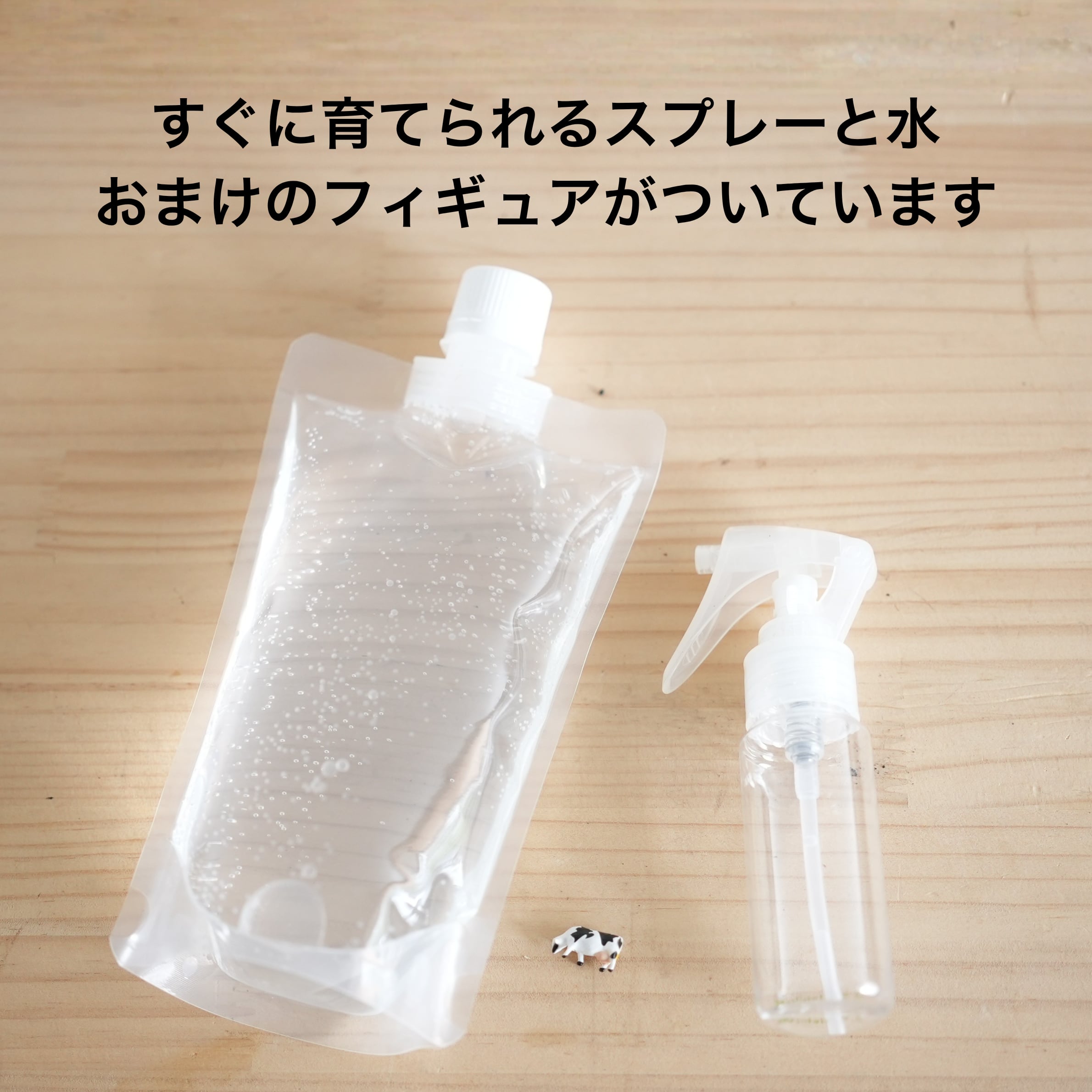 育てるのに必要な水やり用スプレーと、テラリウム水のサンプル、牛のフィギュアが1つついてきます。