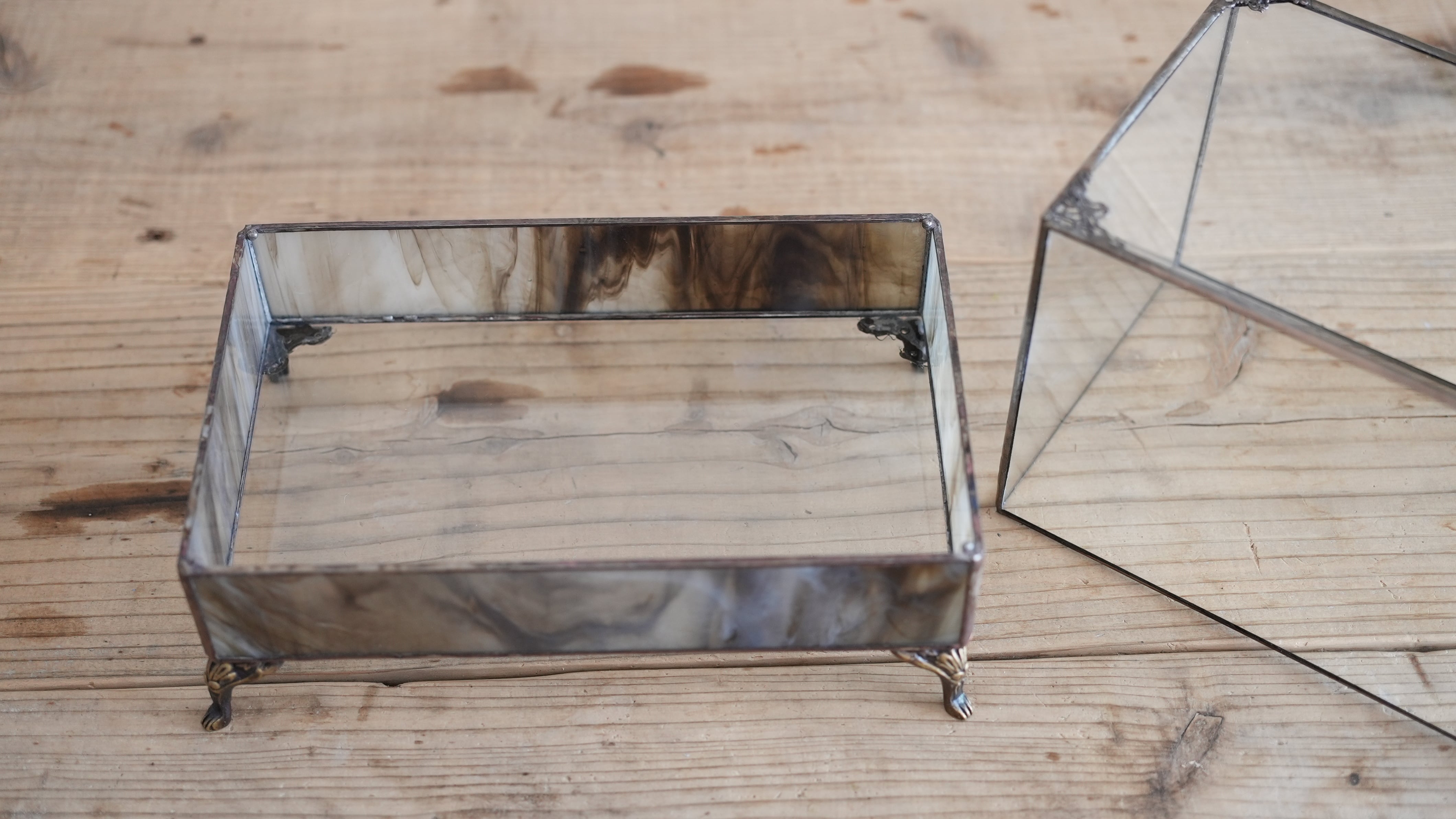 マーブル模様のガラスは、ブルズアイ社のストリーキー(ダークブラウン)ガラス。