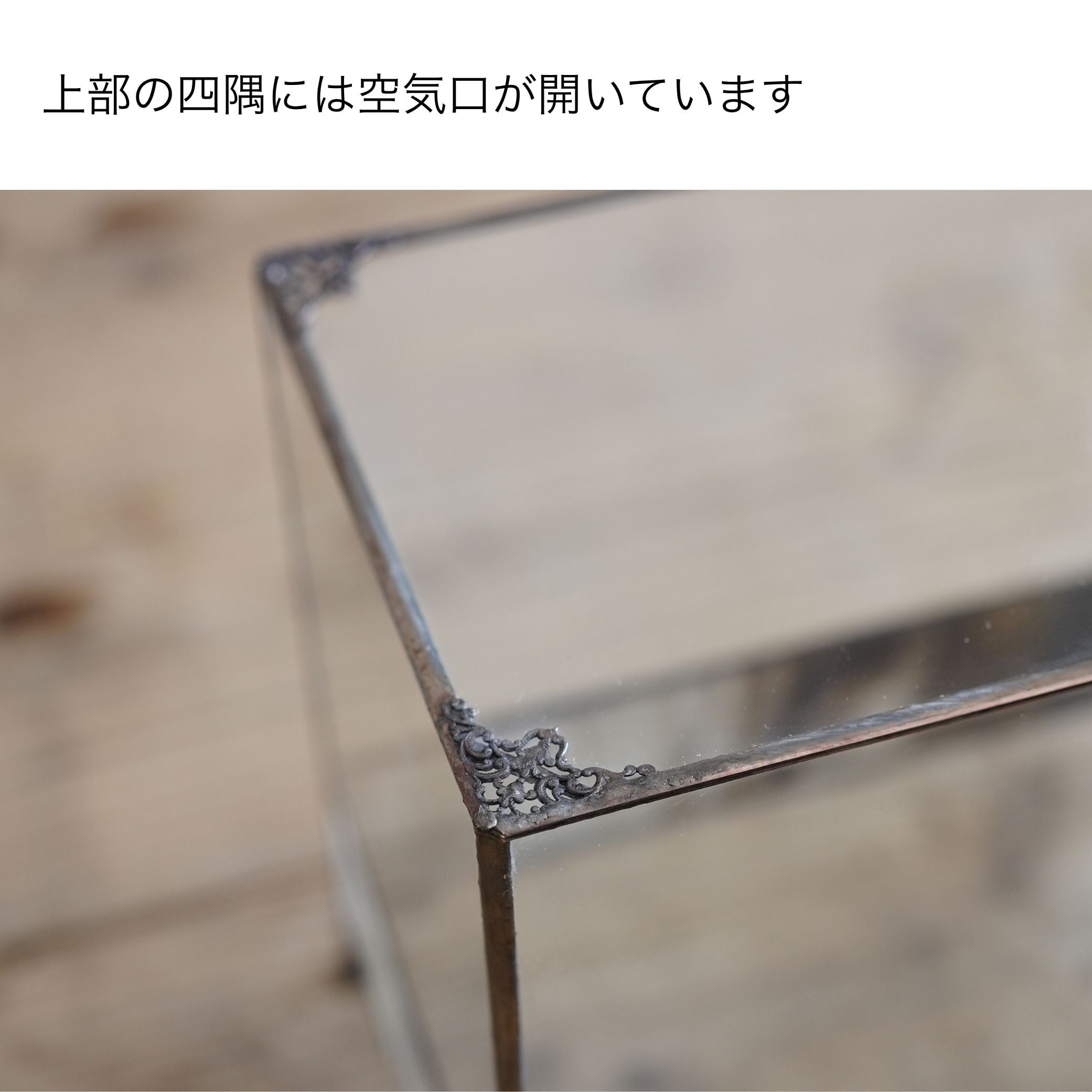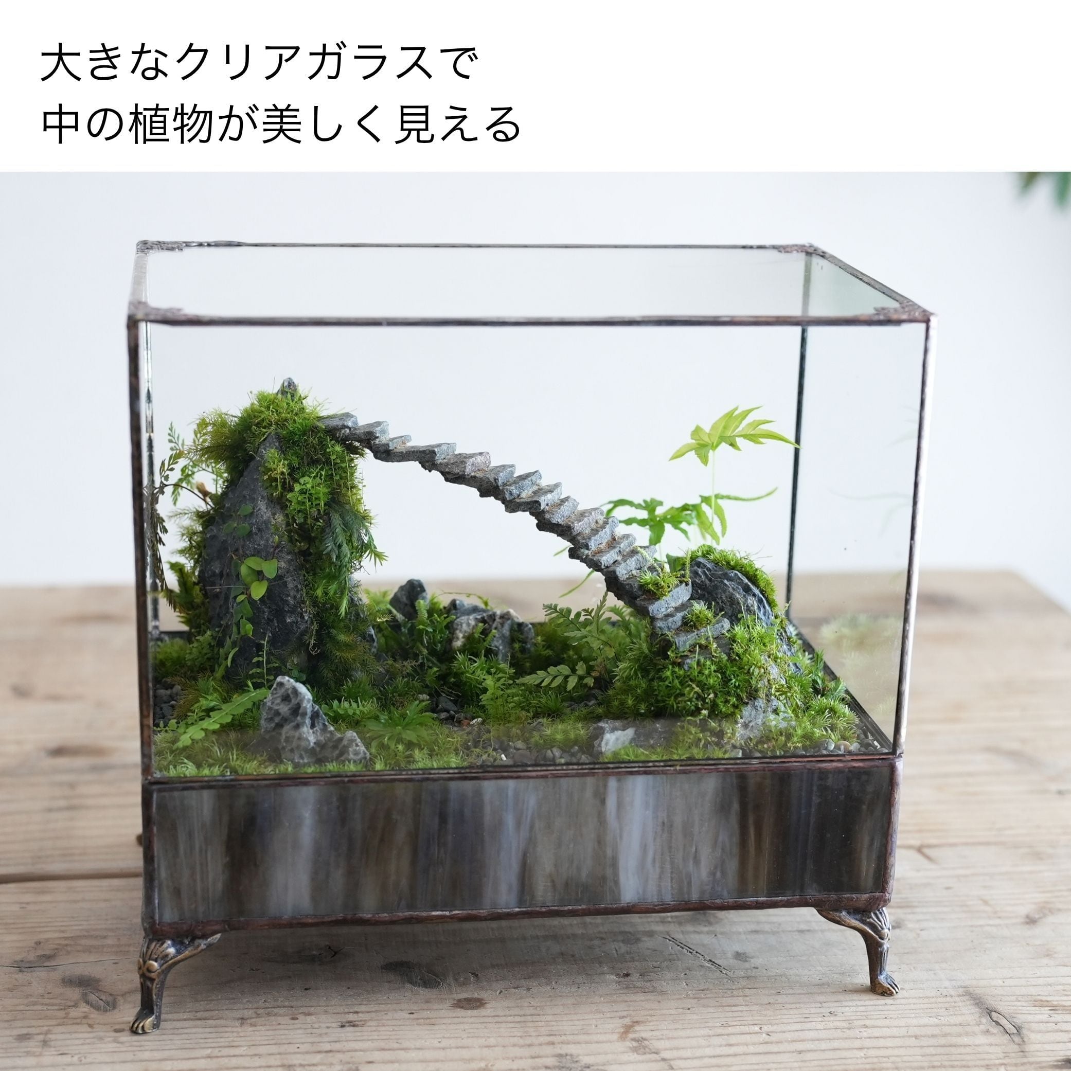 上部のガラスをかぶせるタイプなので作製やメンテナンスがしやすく、中の植物が美しく見える設計です。
