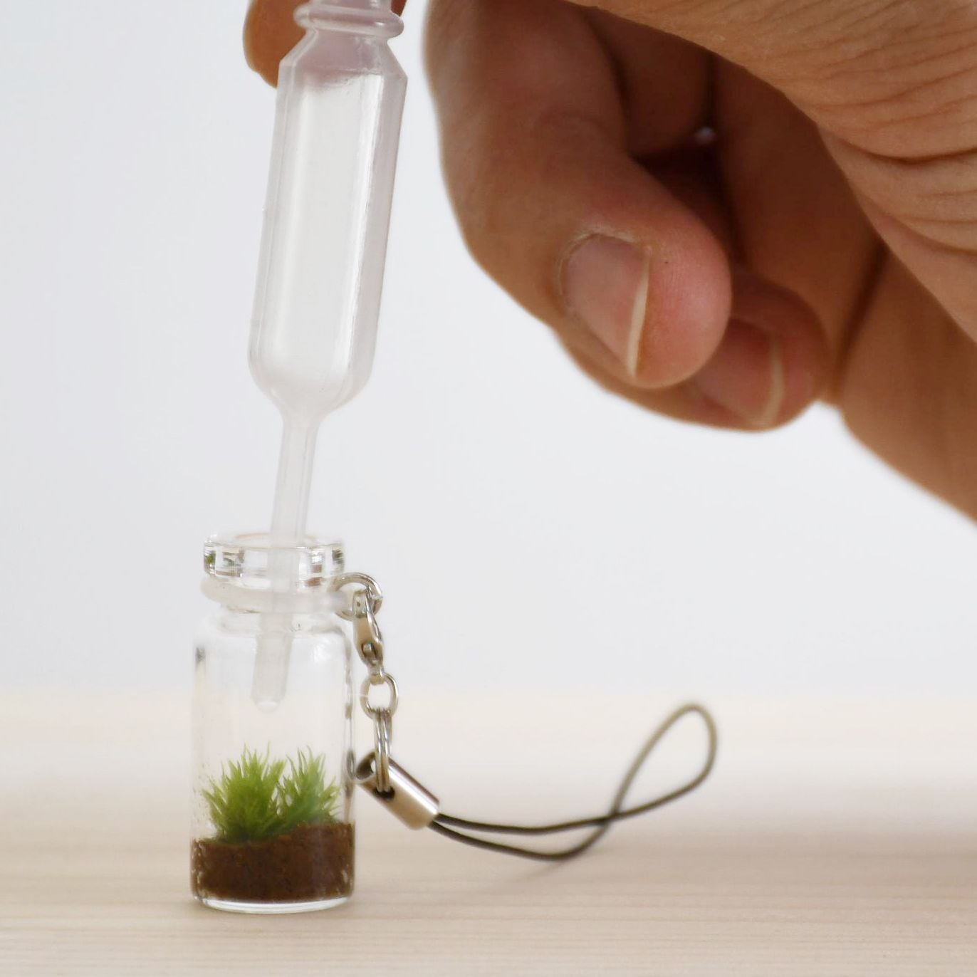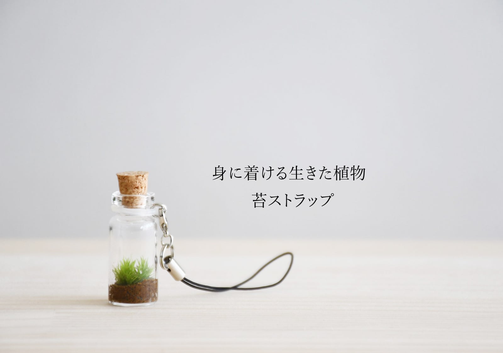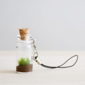 いつでも苔を持ち歩けるように、小さな小瓶にコケを植えてストラップにしました。