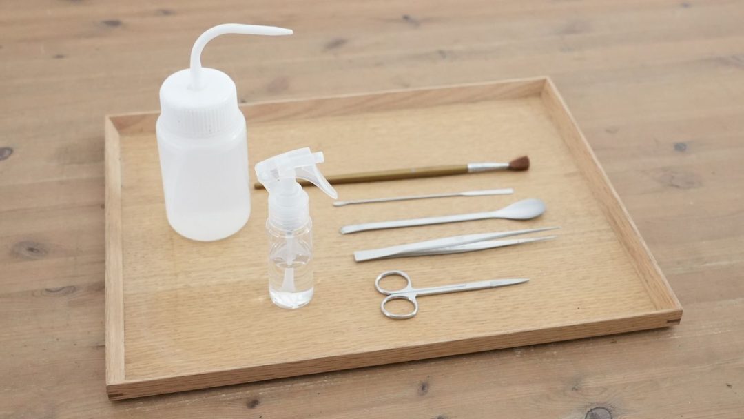 作製のための道具は付属していません。ハサミとピンセット、霧吹きをご用意ください。